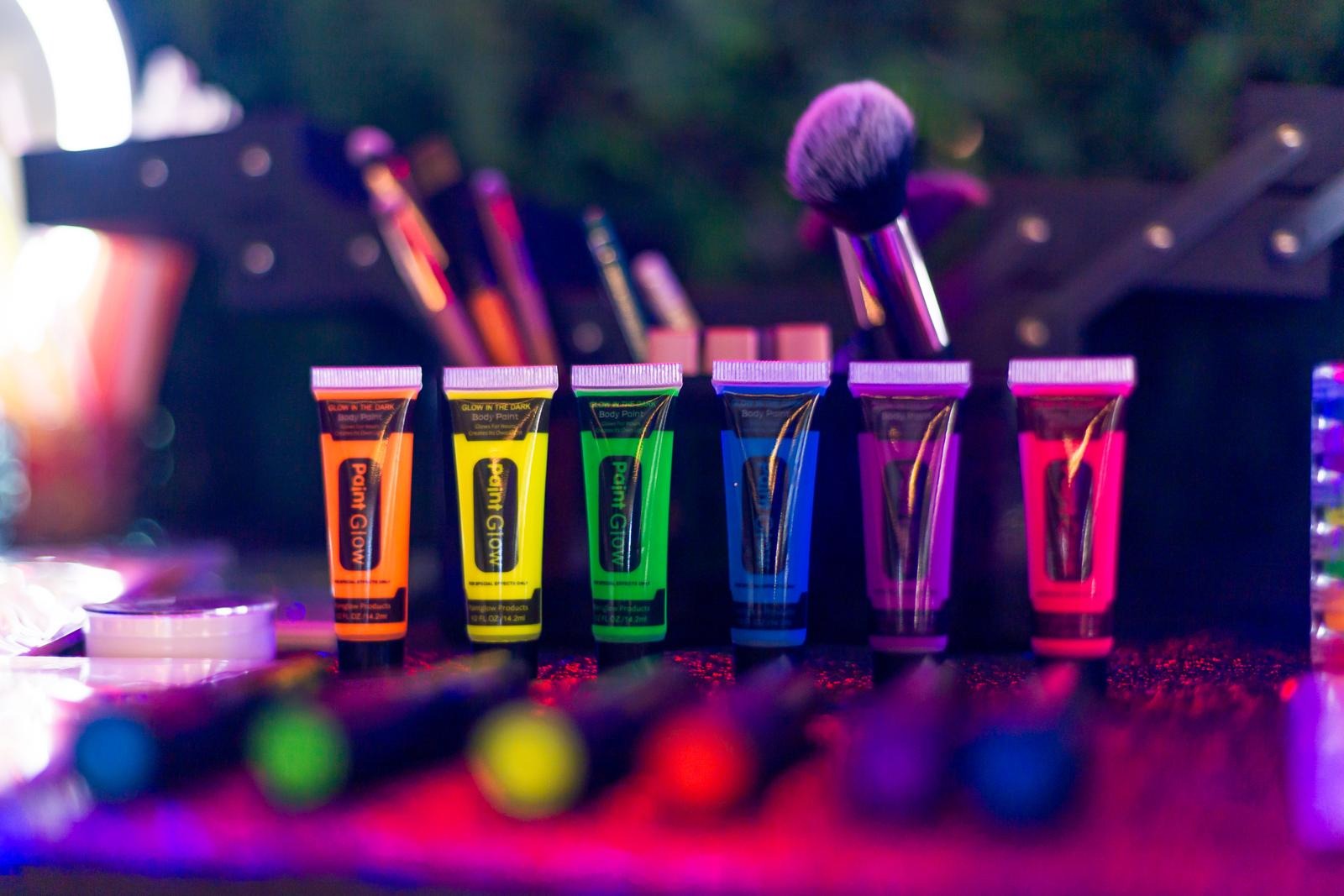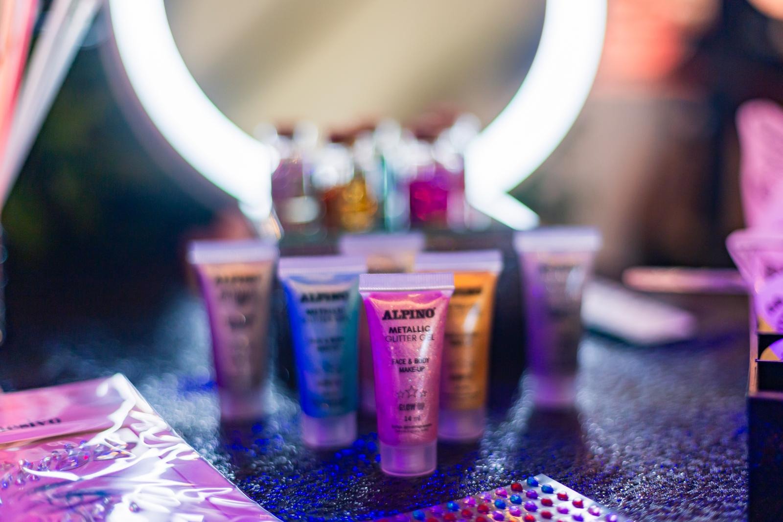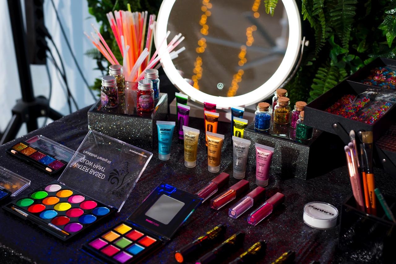 Gel purpurina, gemas, pedrería, tatuajes, sombras y maquillaje, brillo de labios, pulseras y complementos Neon y zona de maquillaje y luz Ultra Violeta, todo ello acompañado de una maquilladora y materiales específicos para la piel.